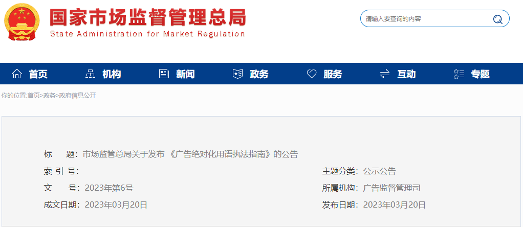 市场监管总局关于发布《广告绝对化用语执法指南》的公告